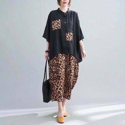 涼しく楽ちんセットアップ セットアップ 韓国ファッション 夏 セットアップ レディース スウェット 豹柄 切り替え 上下セット リネン素材トップス 福袋 T