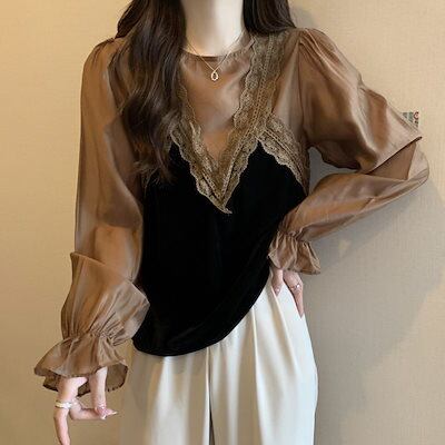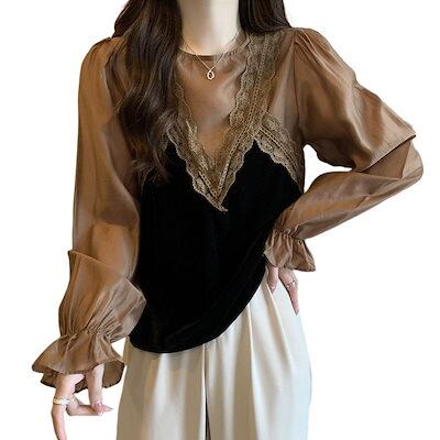 Tシャツ 韓国 韓国 新作 トップス シャツ 切り替え ブラウス アンダーウェア 長袖 フレアスリーブ 着やせ インナー 百掛け 流行り 高級感 フェイクレイヤード