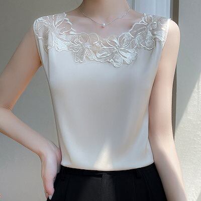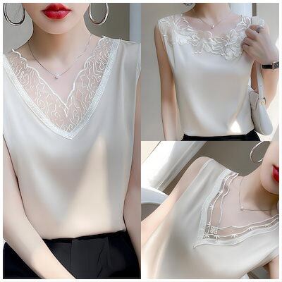 シルクキャミソール レディースノースリーブドレッシートップス シルクブラウスの下に刺繍入りセクシーレースVネックブレザー