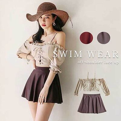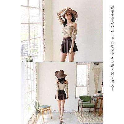 水着 レディース 2点セット ビキニ かわいい 韓国 オフショル カップ 二の腕カバー セパレート ベージュ ブラウン レースアップ お洒落 セクシー 海 ビーチ