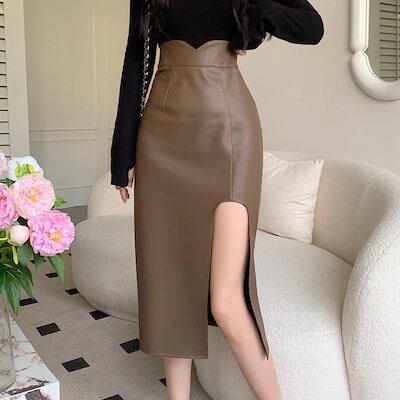 プリーツスカート2024 ニュースタイル セクシー おしゃれ スリット スカート ハイウエスト 着痩せ PUプリーツスカートマーメイドスカート