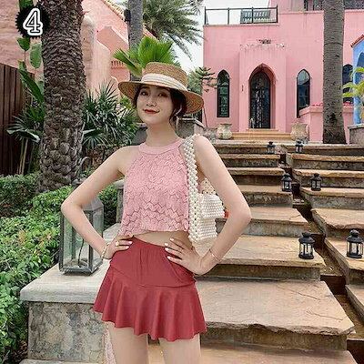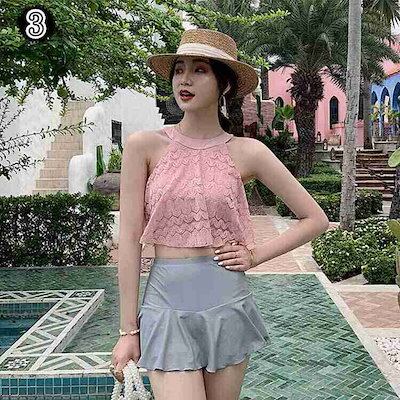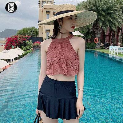 水着 レディース 体型カバー水着 ハイネック ビキニ スカート 2点セット ママ水着 20代 30代 40代 オトナ女子 レース 無地 上下別柄 フレア バックシャン かわいい セクシー パッド付き