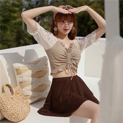 ビキニ 水着 レディース ビスチェ風 ハイウエスト 体型カバー水着 2点セット バックシャン バックフリル かわいい おしゃれ セパレート パッド一体型 ノンワイヤー 無地 上下別柄 セクシー お尻