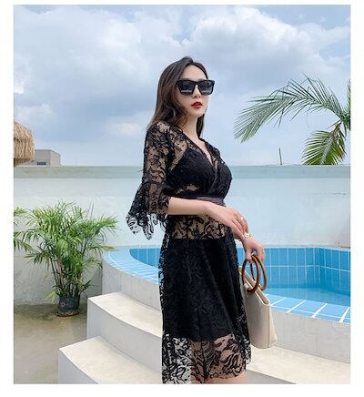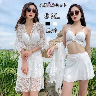 水着 レディース 体型カバー ラッシュガード 3点セット セパレート ビキニ 大きいサイズ 透け感あり レース カバーアップ スカート お腹が露出 水着 お洒落 シンプル 無地vネック ハイレグ ハイ