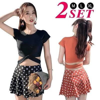 水着 体型カバー水着 レディース ビキニ スカート ショートパンツ 2点セット 半袖 20代 30代 40代 大人 ママ水着 かわいい 大きいサイズ セクシー 二の腕 お尻 バスト モテカワ水着 スト