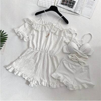 水着 レディース 体型カバー ビキニ 3点セット ショートパンツ ワンピース オフショルダー 露出控えめ オトナ女子 韓国風 かわいい セクシー お洒落 肩出し オフショルダー ビスチェ 白 オシャ