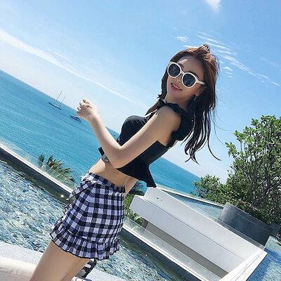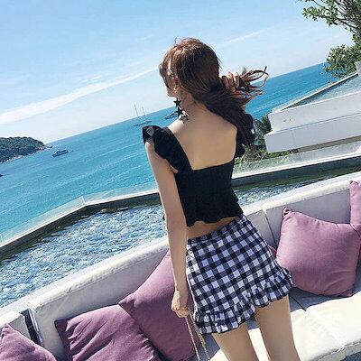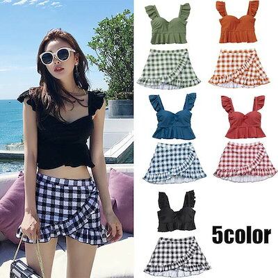 水着 レディース タンキニ 2点セット ジュニア 女の子 スカート 体型カバー 韓国 パッド付き ノーワイヤー セパレート フリル かわいい 無地 花柄 レース フリーサイズ 可愛い お洒落 くすみカ
