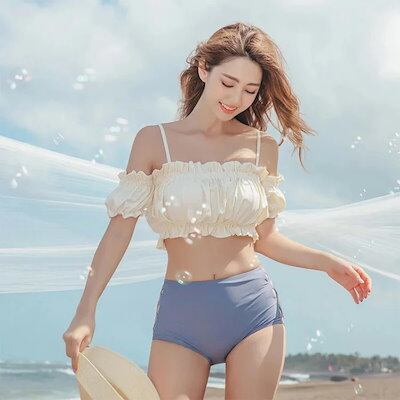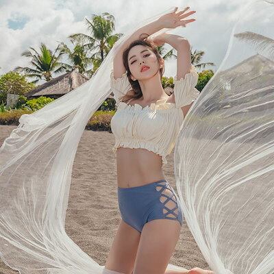 水着 レディース ビキニ 体型カバー ハイウエスト 水着 2点セット パッド一体型 ワイヤー入り リブニット オフショルダー オトナ女子 セクシー バックシャン お洒落 可愛い 水着露出控えめ ママ水
