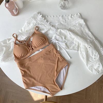 水着 3点セット レディース ビキニ ブラウス セパレート スイムウェア 上下セット 長袖 オフショルダー レース 紐 体型カバー 袖ゴム 日除け 紫外線対策 日焼け対策 水泳用品 女性用 婦人用 可