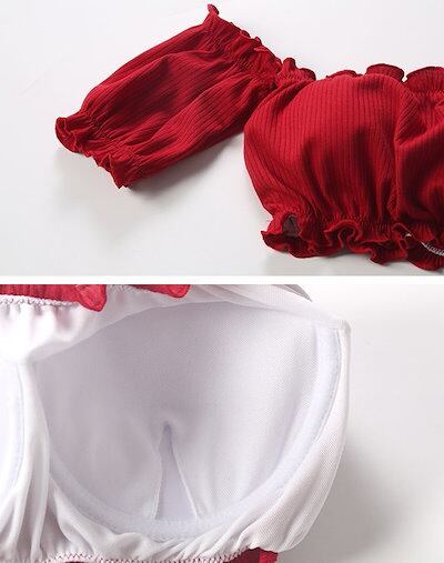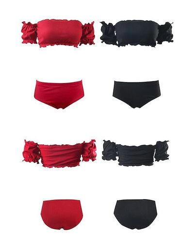 水着 上下セット 2点セット セパレート レディース スイムウェア オフショル ギャザー ハイウエスト パッド入り リブ フリル 無地 シンプル 体系カバー かわいい 大人可愛い フリフリ セクシー