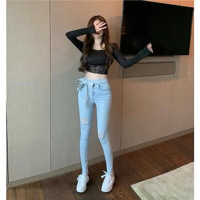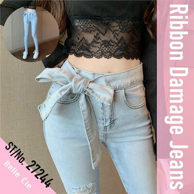 デニムパンツ リボンダメージ スキニーパンツ ジーンズ デニム レディース 共地ベルトリボン 韓国ファッション20代 30代 40代 50代