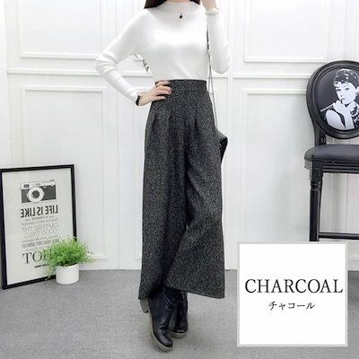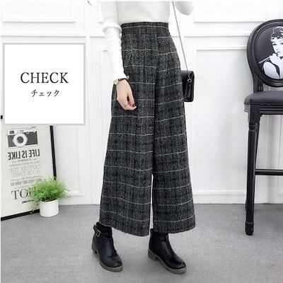 本日限定 ガウチョパンツ 秋冬 ワイドパンツ チェック柄 無地 ウエストリボン レディース ハイウエスト ウール混 クロップド丈 ウエストゴム フレアパンツ ワイドパンツ ボトムス 体型カバー