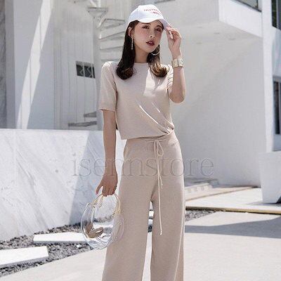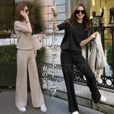 人気新作 ニットセットアップ 春夏 ガウチョパンツ ス 半袖 サマーニット レディース ニット ス 無地 セットアップ オシャレ シンプル 通勤