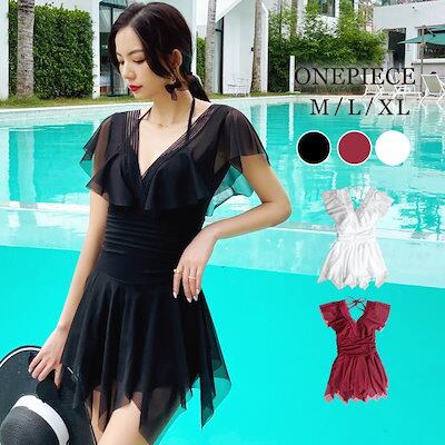 ママ ランダムフリル ダイビングネック 黒 40代 水着 白 ワンピース水着 リゾート水着 レディース ミセス 体型カバー ワイヤー入り ワンピース 赤 30代