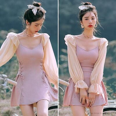 水着レディース ショートパンツ ワンピース 長袖 ワンピース水着 可愛い ポエットスリーブ レースアップ ブラック ピンク 体型カバー ワイヤーなし