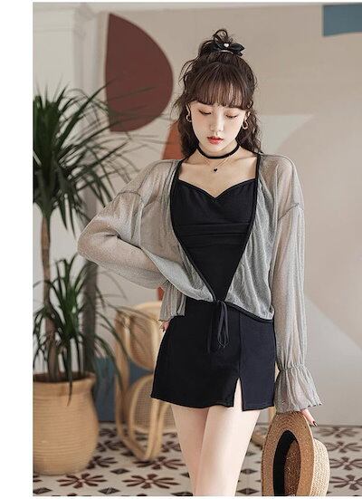 ワンピース水着 服みたいな 水着 3点セット 長袖 リボン ワイヤーなし パッド付 レディース 着?せ シンプル 写真映え 撮影用 海 夏 サマー プール リゾート かわいい オシャレ 旅行 温泉 大