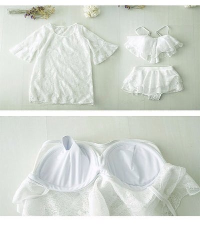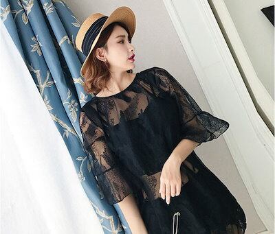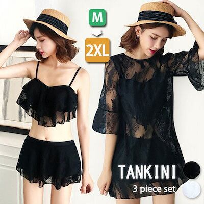 タンキニ 水着 レディース 体型カバー 黒 透け素材 大きいサイズ キャミソール インナーパンツ アンダーフリル ローレグ ワイヤーなし パッド付 ラッシュガード 袖あり レース セパレート 海 プー