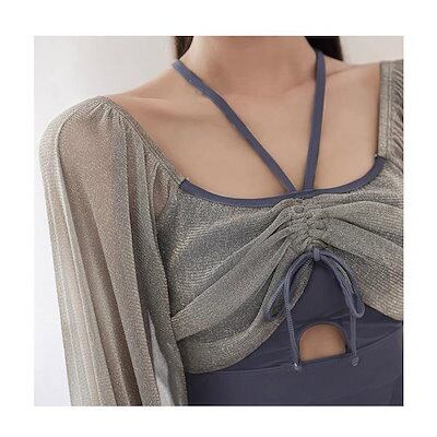 着せ ワイヤーなし パッド付 レディース リボン ワンピース水着 長袖 2点セット 水着 フリル シンプル 透け感あり