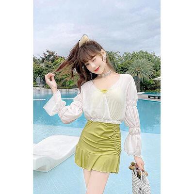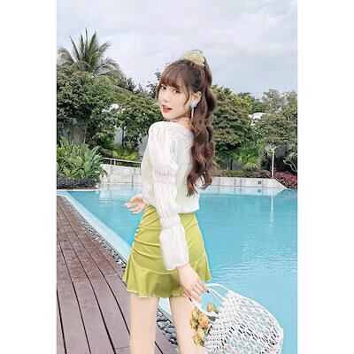 透け感あり グリーン 旅行 長袖 体型カバー 水着 ワイヤーなし ワンピース水着 2点セット 服みたいな パッド付 フリル 着痩せ レディース 無地 温泉