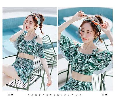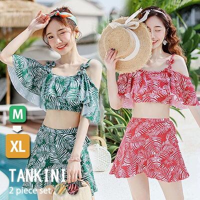 フレア水着 タンキニ レディース オフショルダー 半袖付き キャミソール インナーパンツ ハイウエスト ボーイレッグ ワイヤーなし パッド付 ボタニカル柄 リーフ 葉っぱ 体型カバー セパレート 海