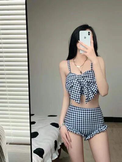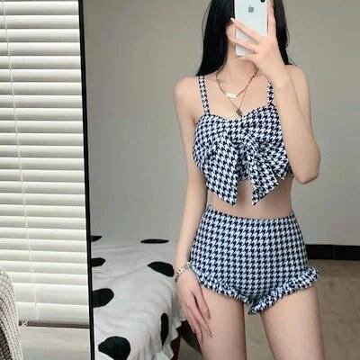 [cos衣料]24発売水着 ハイウエストカバー 千鳥格子ビキニ 小胸ギャザー レディース お腹見せ ワイヤー入り 細身