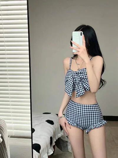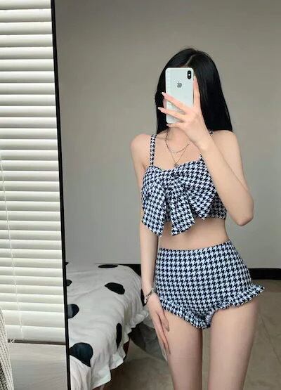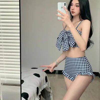 24発売水着 ハイウエストカバー 千鳥格子ビキニ 小胸ギャザー レディース お腹見せ ワイヤー入り 細身
