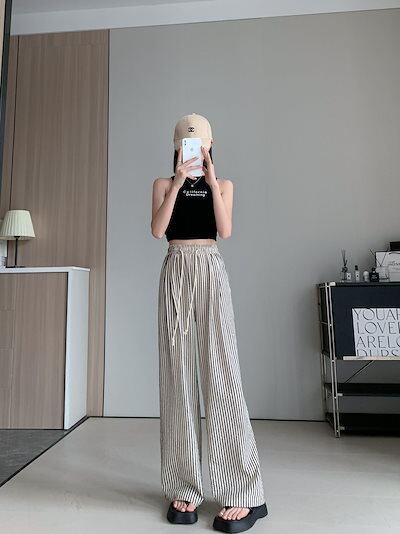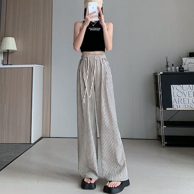 【2件配達料無人気】ストライプ パンツ レディース 春 夏 秋 ワイドパンツ ボトムス パンツ ワイド スラックス ひんやり 接触冷感 ロング丈 ワイドパンツ ストライプ柄