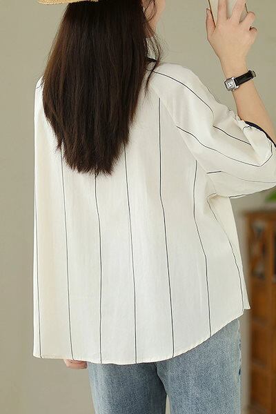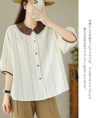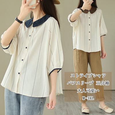 ストライプシャツ 半袖 シャツブラウス レディース パフスリーブ 折り襟 ボタン 前開き ストライプ ブラウス ドッキング ボリューム袖 トップス 大きいサイズ ゆったり 体型カバー 薄手 涼しい き