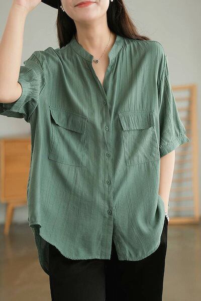 ブラウス スキッパー シャツ 半袖 レディース シャツブラウス 夏 春 パフスリーブ タック Vネック 前開き ボタン ポケット 前後差 無地 ギャザー トップス 大きいサイズ ゆったり 体型カバー