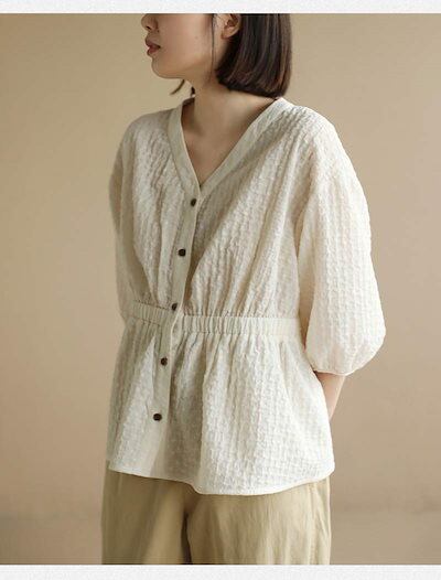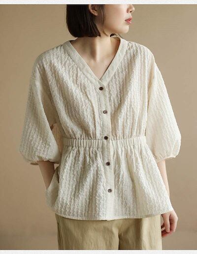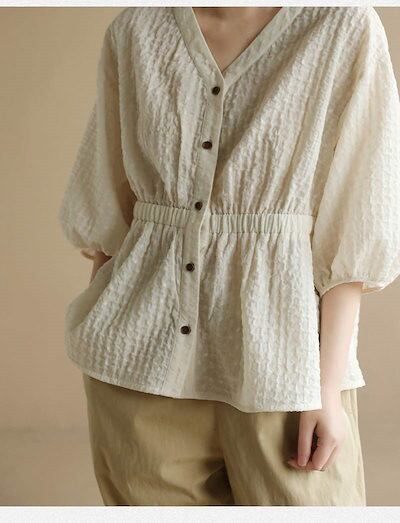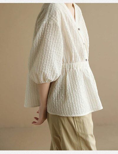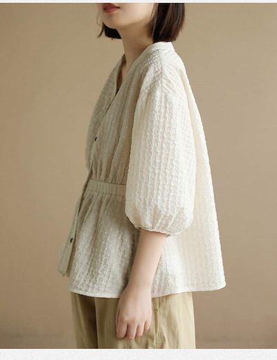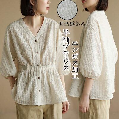 半袖ブラウス レディース エンボス加工 五分袖 トップス 半袖 Vネック プルオーバー ボタン付き 前開き Aライン ジャガード ブラウス 凹凸感 体型カバー ゆったり カジュアル 可愛い おすすめ