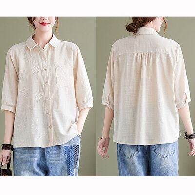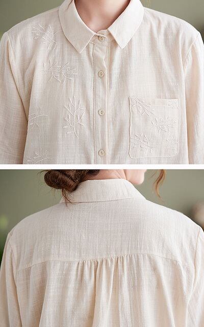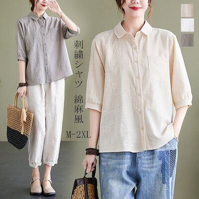 刺繍シャツ レディース 綿 麻 シャツ 半袖シャツ 春 夏 五分袖 折り襟 前開き ボタン 白シャツ 刺繍 半袖 ポケット付き コットン リネン トップス 通気 カジュアル きれいめ リネンシャツ ゆ