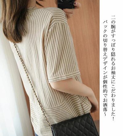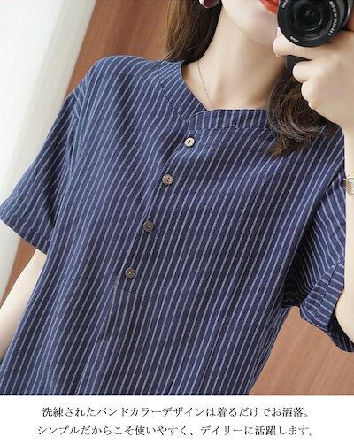 ストライプ ブラウス 半袖 シャツ レディース 春夏 シャツブラウス ドッキング コットン バンドカラー ボタン プルオーバー ストライプ柄 トップス ゆったり 大きいサイズ 体型カバー Tシャツ 通