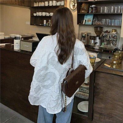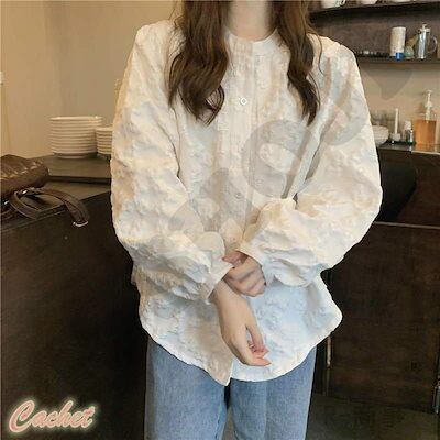 白シャツ シャツブラウス 春夏 きれいめ 長袖 春物 レディース 前開き ボリューム袖 ゆったりラウンドネック レース ボタン止め フレア裾口