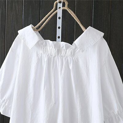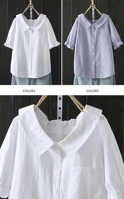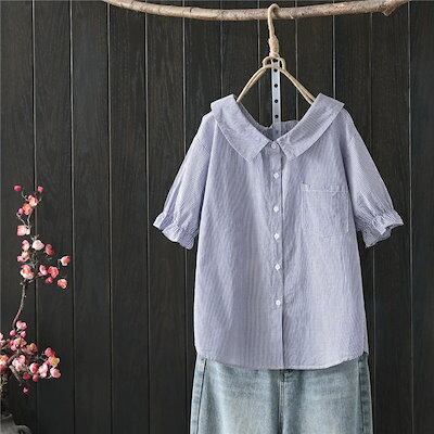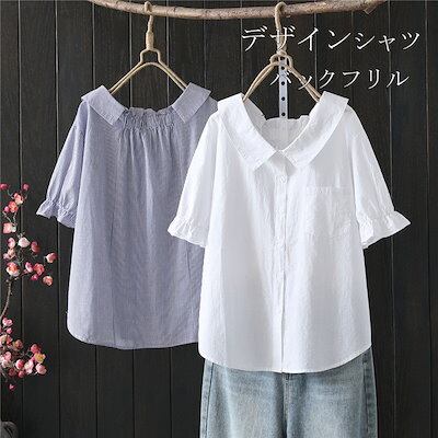 ストライプ シャツブラウス フリル レディース ギャザー 夏 シャツ 半袖 ブラウス 綿 フリル襟 トップス バックタック 全開 ボタン止め 可愛い 折襟 半袖シャツ ナチュラル 大人 カジュアル風