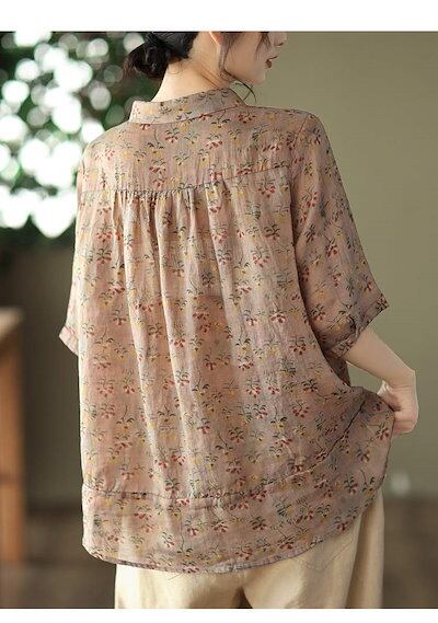 シャツ 半袖 レディース チュニック 花柄 大きいサイズ 体型カバー シャツブラウス 春夏 折り襟 五分袖 夏シャツ 五分袖 開襟 ボタン付き 総柄 トップス 綿麻風 切り替え ポケット 透け感 通気