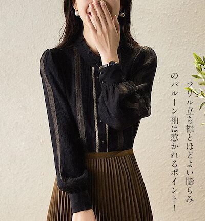 シャツ 長袖 レディース フォーマル オフィス 黒 白 ワイシャツ トップス フリル襟 ドッキング 異素材切り替え シャツブラウス バルーン袖 2枚重ね 透けない ブラウス 前開き ボタン留め きれい