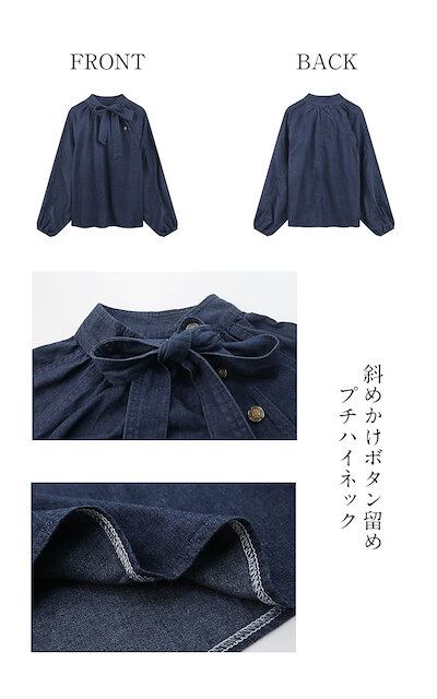 ボウタイブラウス レディース 長袖 プルオーバー ブラウス デニム ボウタイ トップス プチハイネック シャツブラウス バルーン袖 ボリュームスリーブ 斜めボタン 春秋 春 カジュアル おしゃ
