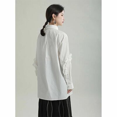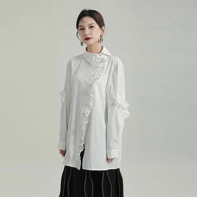 フリルシャツ ブラウス レディース トップス ロング丈 シャツ デザイン襟 長袖 斜めボタン 胸元フリル タック 無地 きれいめ モード系 変形デザイン アシンメトリー シャツ オケージョン きれいめ