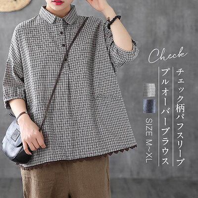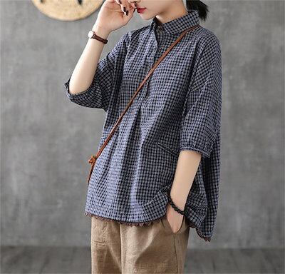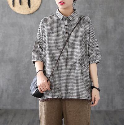 綿麻風 シャツ ブラウス レディース 半袖 シャツブラウス おしゃれ シャツ レディース シャツブラウス レディース 大きいサイズ チェック ゆったり トップス ボタン 綿麻調 裾レース切り替え レト