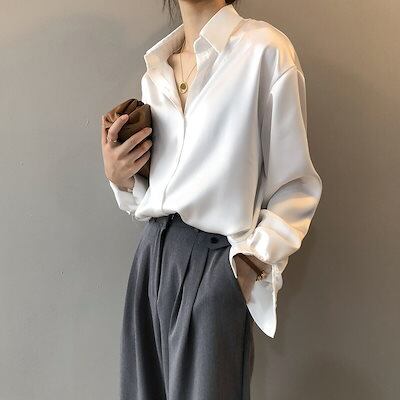 シャツ ブラウス レディース トップス 長袖 ロングスリーブ 襟付き 前開き 無地 春 夏 春夏 サテン とろみ感 フロントボタン 光沢 高級感 ゆったり 体型カバー エレガント シンプル モダン 4