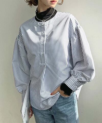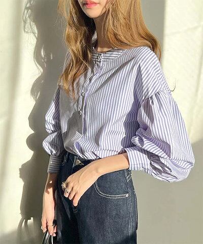 シャツ レディース ストライプ ブラウス 春 夏 秋 長袖 ドルマン トップス ボタン ぽわん袖 体型カバー バンドカラー カジュアル ボリューム袖 ストライプシャツ キレイめ 通勤 大人 スッキリ