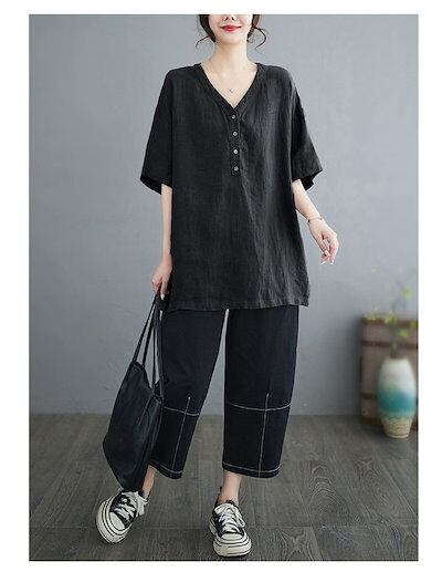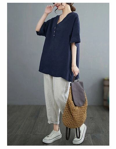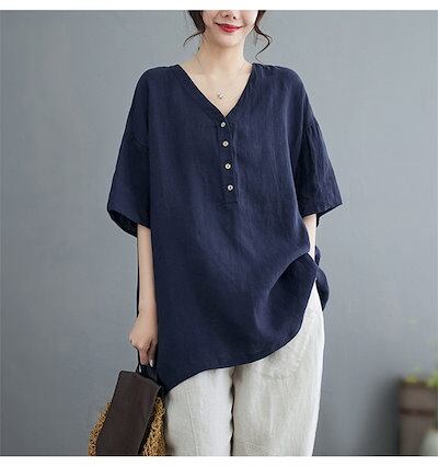 チュニック 半袖シャツ 綿麻風 レディース ロングシャツ 無地 シャツ Vネック プルオーバー ブラウス 無地シャツ 半袖 夏 大きいサイズ ゆったり トップス チュニック丈 5分袖 シンプル 綿麻混