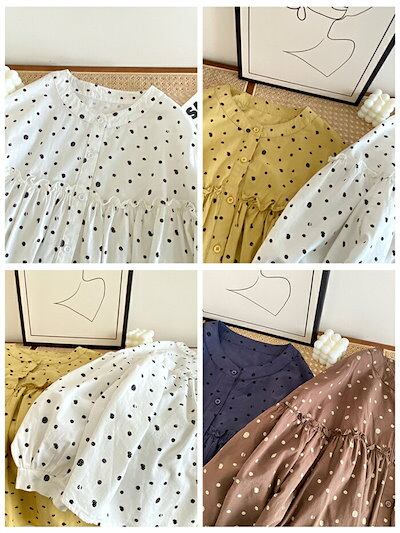 チュニック レディース シャツ トップス シャツブラウス 長袖ブラウス 長袖シャツ 春 夏 綿シャツ ドット柄 バルーンスリーブ バルーン袖 コットン 羽織り アウター 体型カバー ゆったり ノーカラ