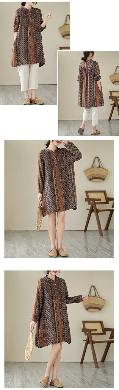 チュニックブラウス 花柄 レディース ロングシャツ 配色 長袖 プルオーバー スタンドカラー 綿麻風チュニックワンピース 切替 トップス コットン リネン混 森ガール キレイめ 大きいサイズ 体型カバ