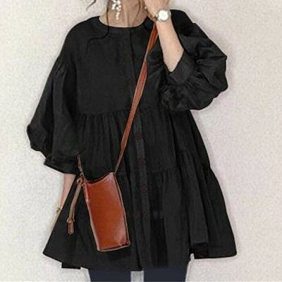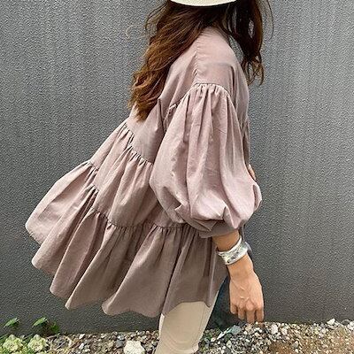 チュニック シャツブラウス ブラウス シャツ レディース ワンピース 春 夏 ロングシャツ 薄手 五分袖 大きいサイズ トップス フレア裾 ロングTシャツ 体型カバー レアシルエット ギャザー入り ゆ