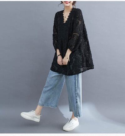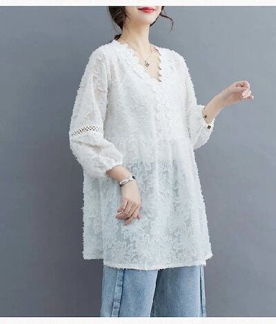チュニック ブラウス レディース 半袖 Vネック 立体感生地 花柄 ボリューム感 春 秋 夏 トップス ゆったり オシャレ 大人 シンプル フェミニン カジュアル 体型カバー 大きいサイズ 20代 3