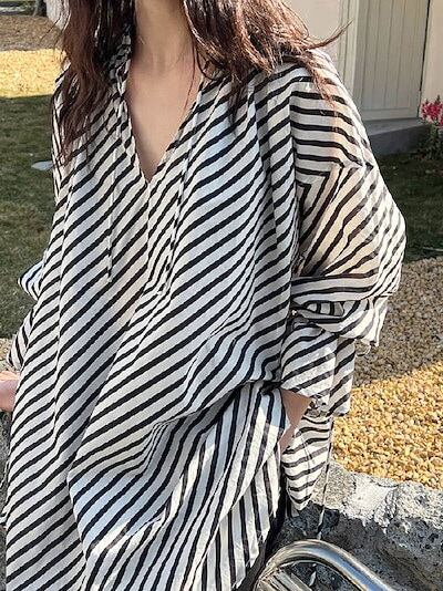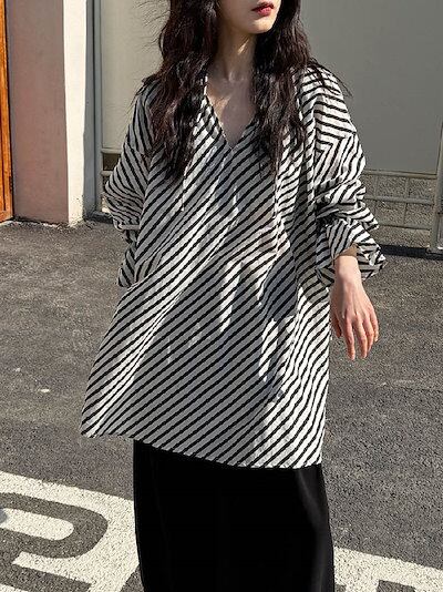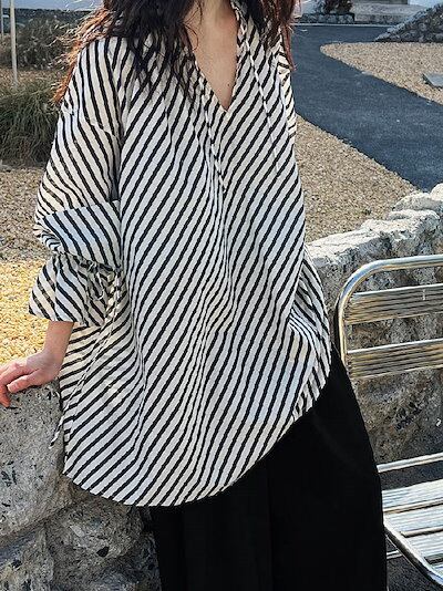チュニック 長袖 レディース 夏 春 秋 フレア袖 フリル袖 大きいサイズ ゆったり チュニック ストライプ柄 Tシャツ ロンT ブラウス キーネック オシャレ カジュアル 着回し 体型カバー ゆった