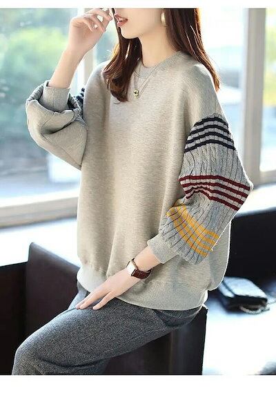 カットソー レディース 長袖 トップス 秋 冬 袖デザイン ボーダー柄 ニット 異素材 切替 プルオーバー チュニック 暖かい キレイめ 厚手 大きいサイズ ゆったり 体型カバー カジュアル 柔らかい