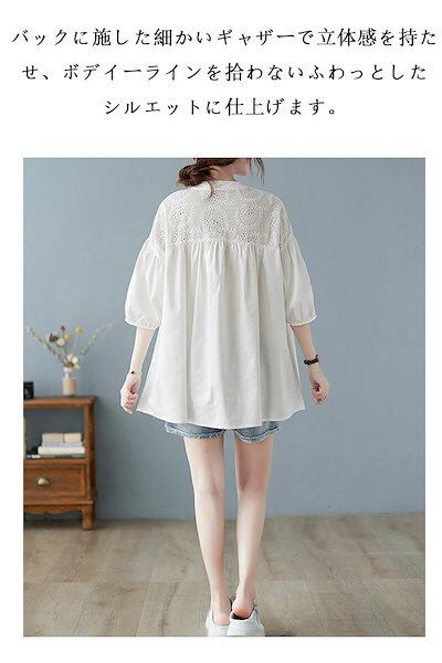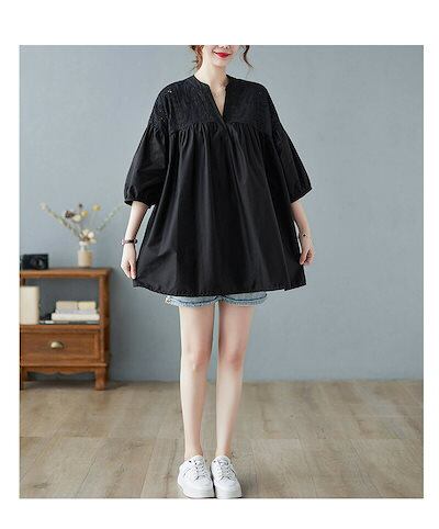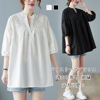パフスリーブ ブラウス レディース 半袖 チュニック 透かし彫り 刺繍 Vネック ギャザー シャツブラウス ロング 春夏 タック プルオーバー トップス 大きいサイズ ゆったり 薄手 無地 ブラック