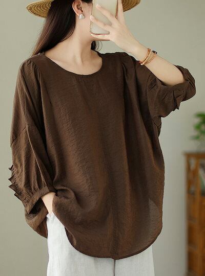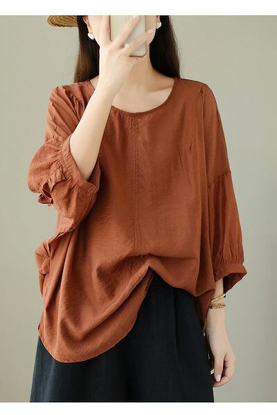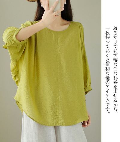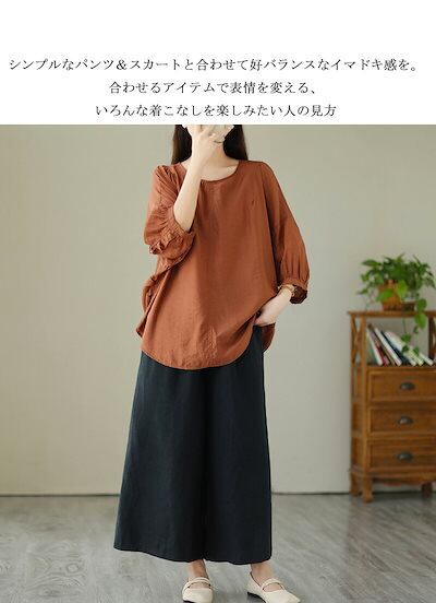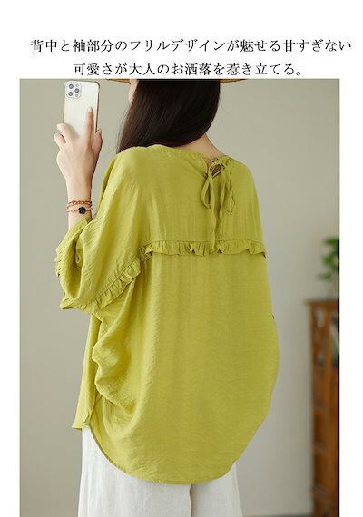 フリルブラウス レディース 春夏 ブラウス パフスリーブ チュニック 七分袖 シャツ フリル バックリボン クルーネック ボリューム シャツブラウス チュニック丈 無地 大きいサイズ トップス ゆった
